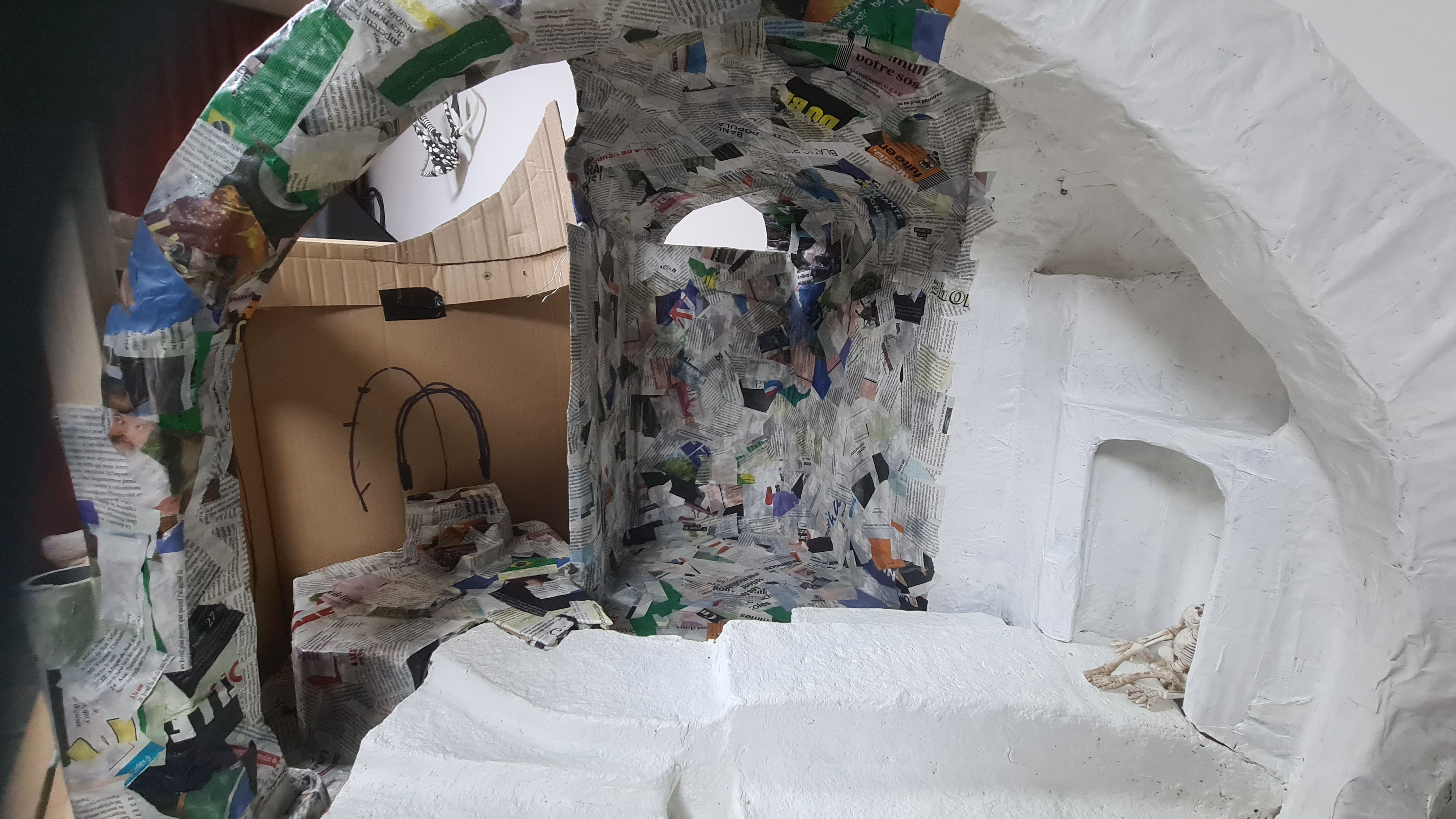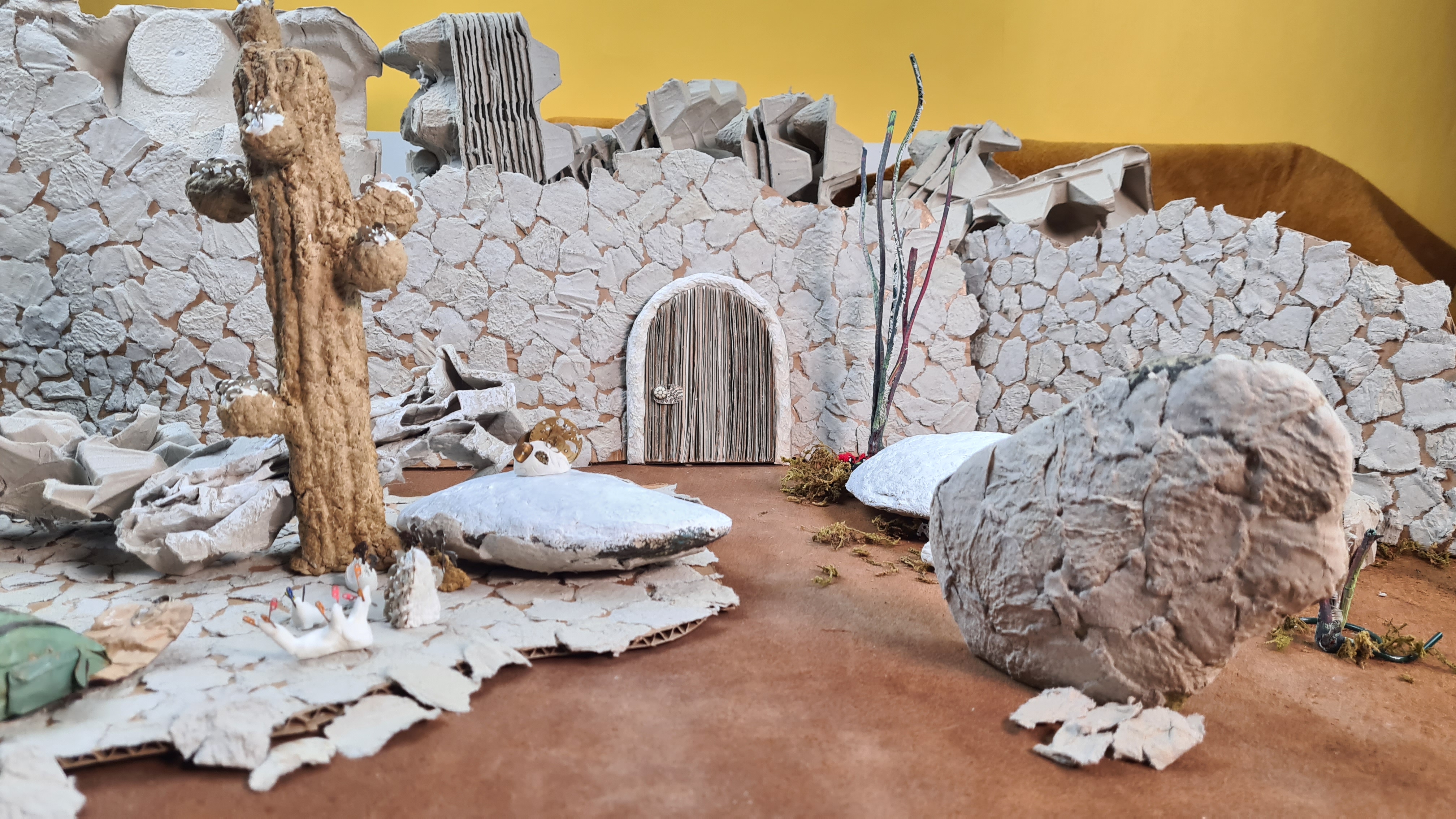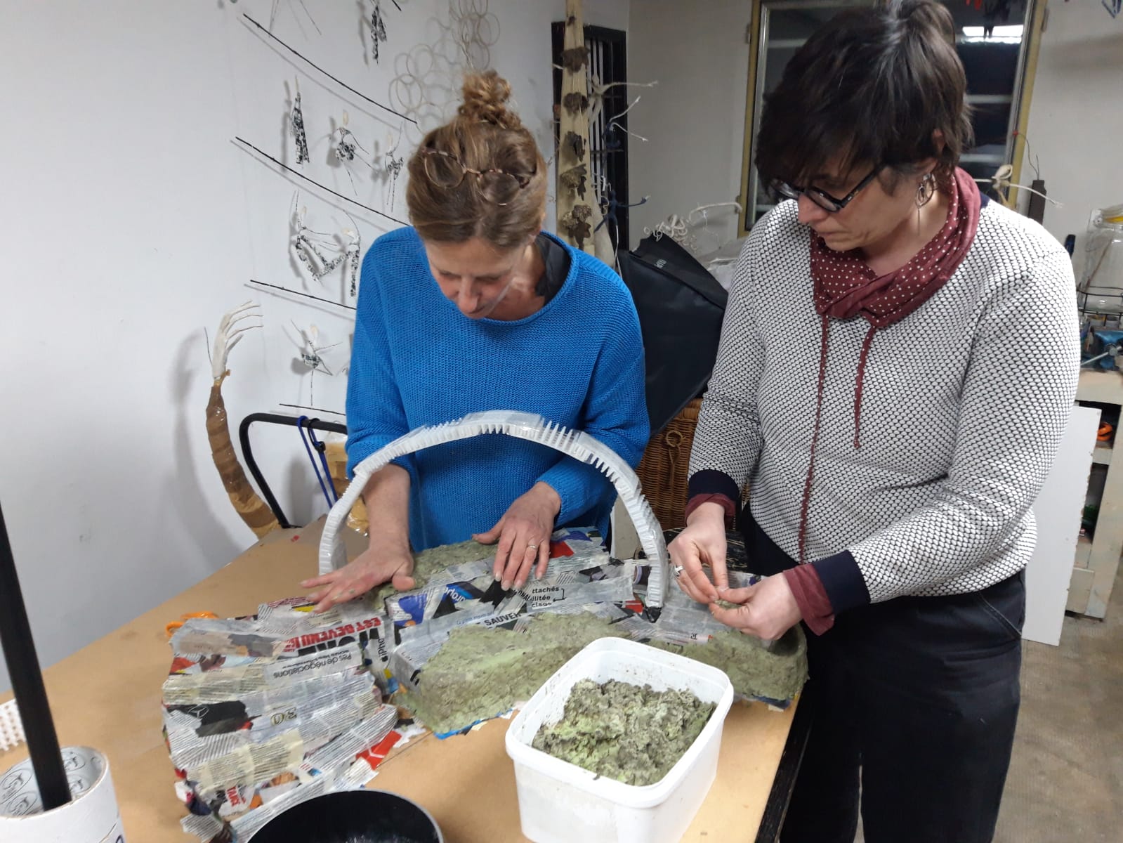 Papiers, cartons, mousse, boite d’oeufs, perles, boutons, peau en cuir, daim, sable … un point d’honneur à été donné sur la réutilisation de matériaux.